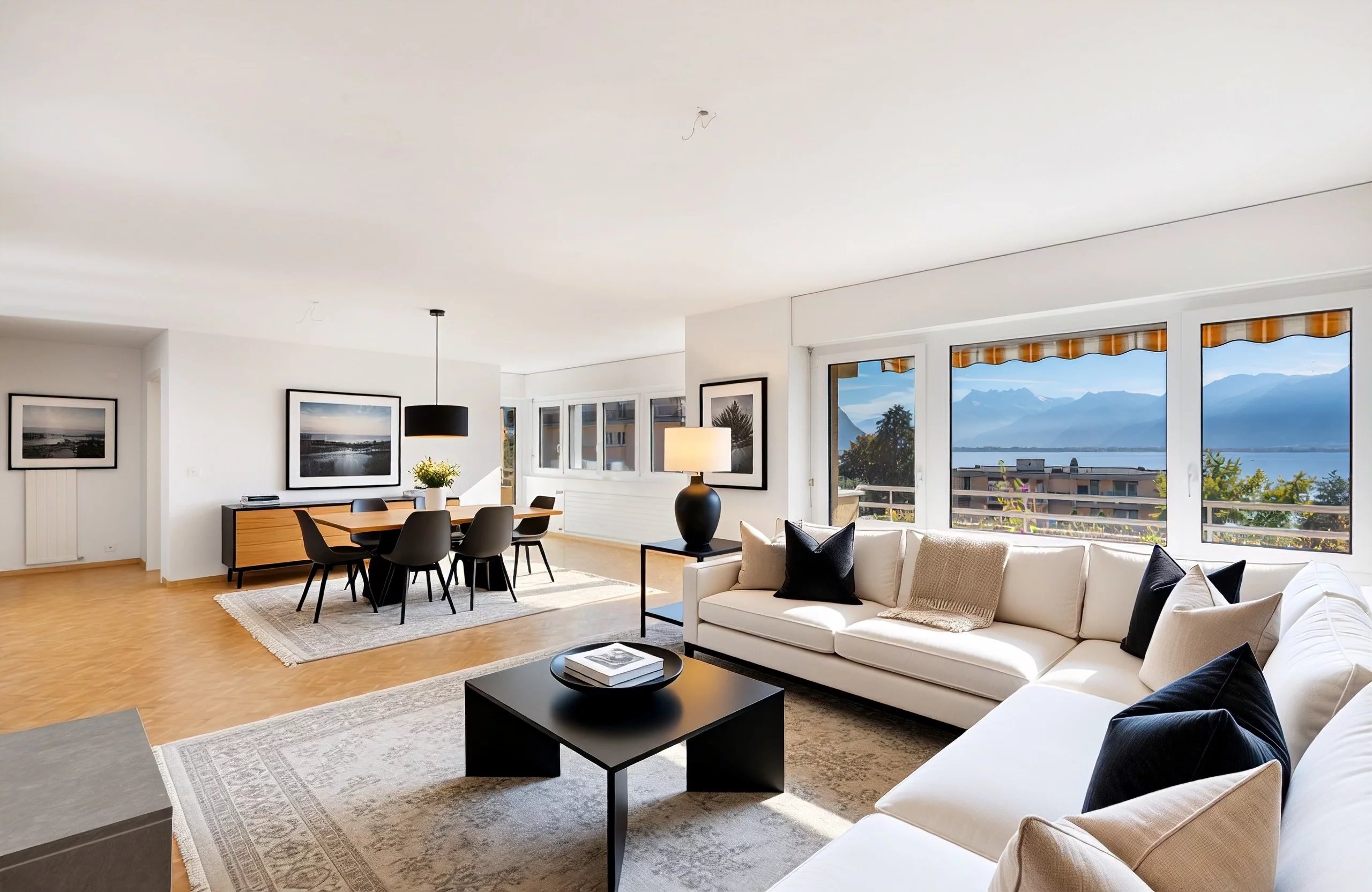 It enjoys a lovely view of the Dents du Midi, the lake and the mountains.