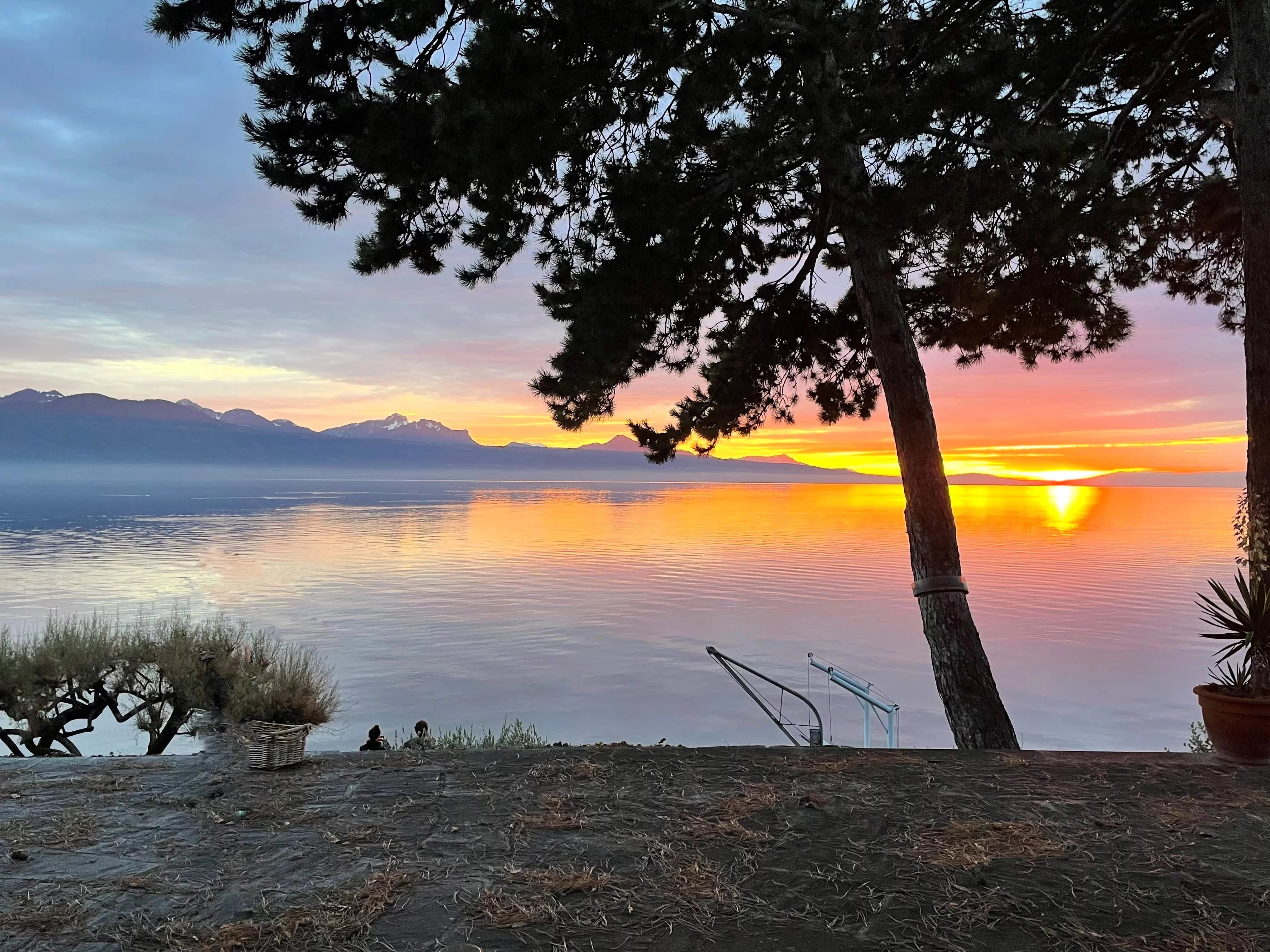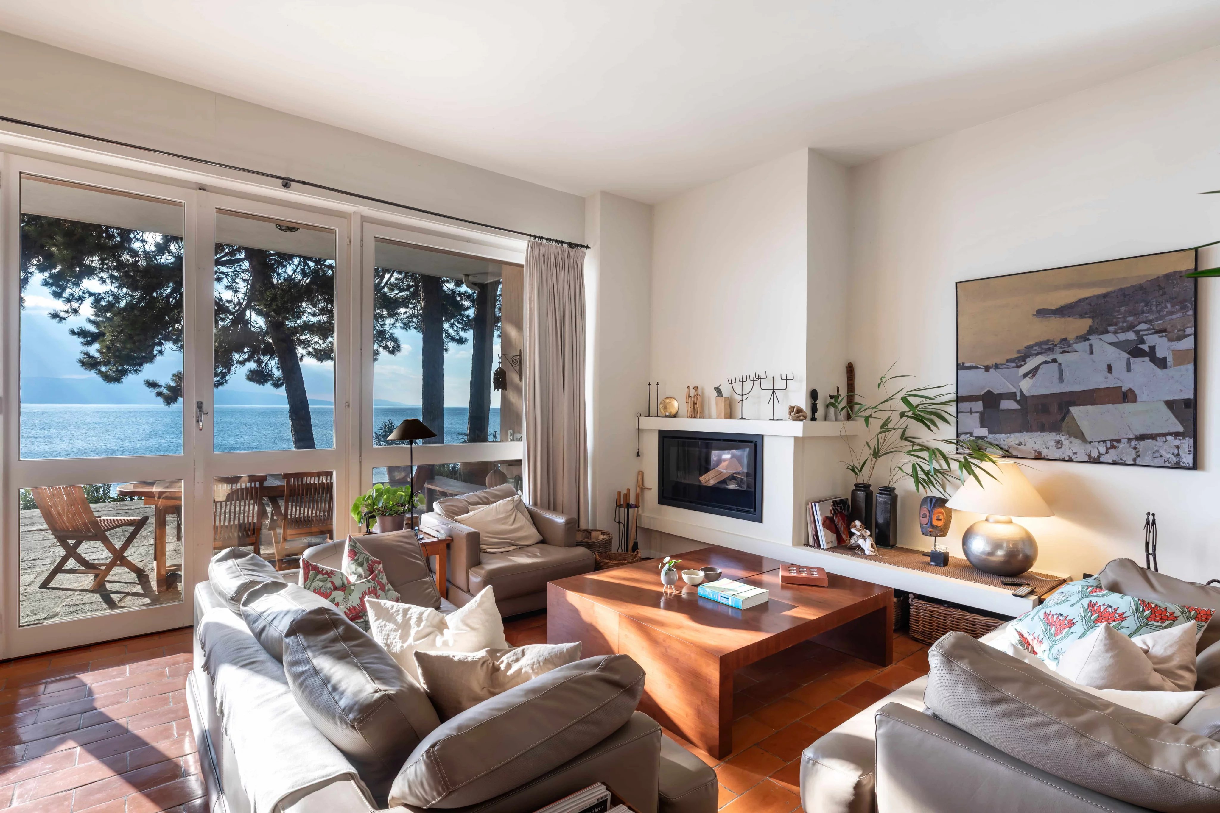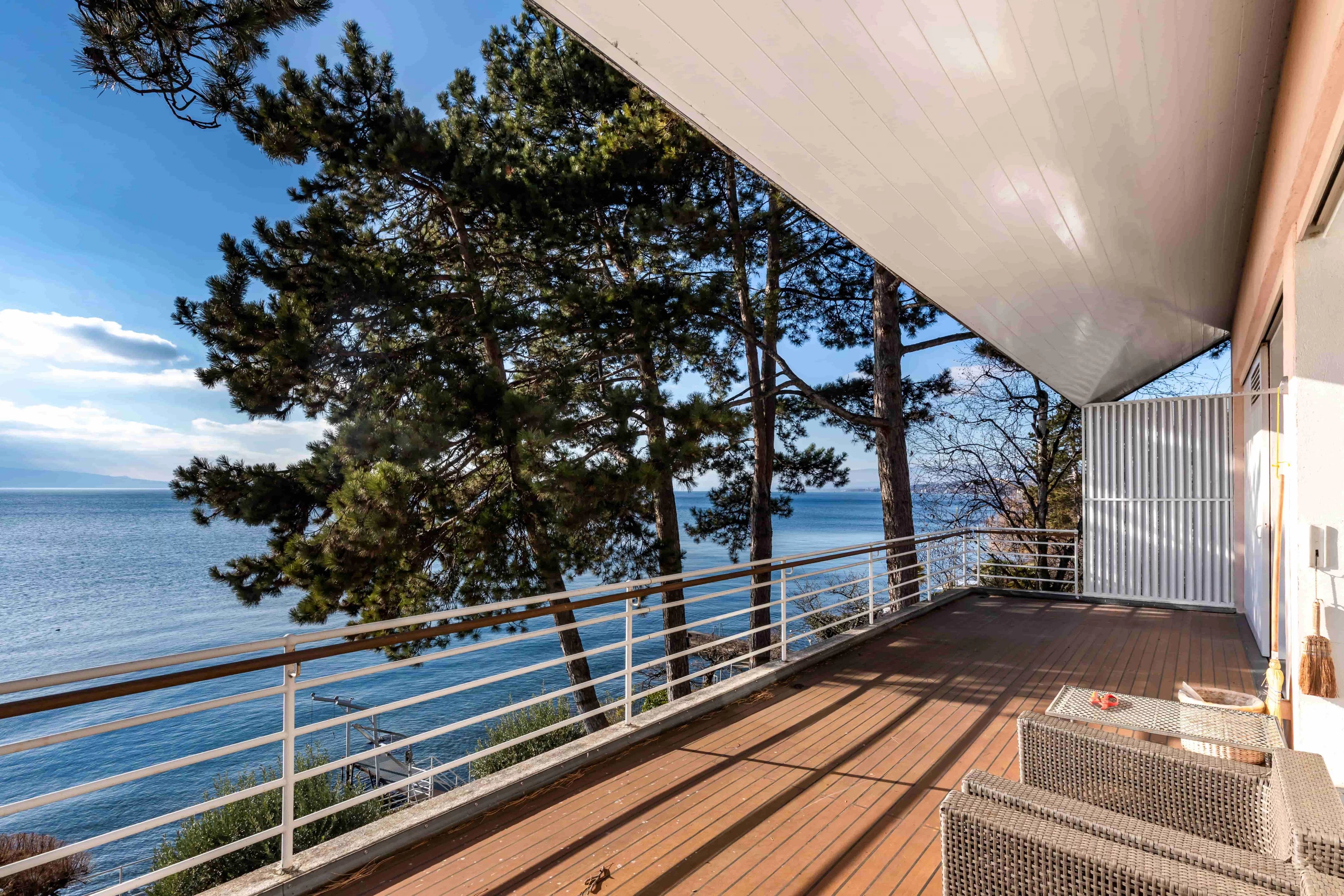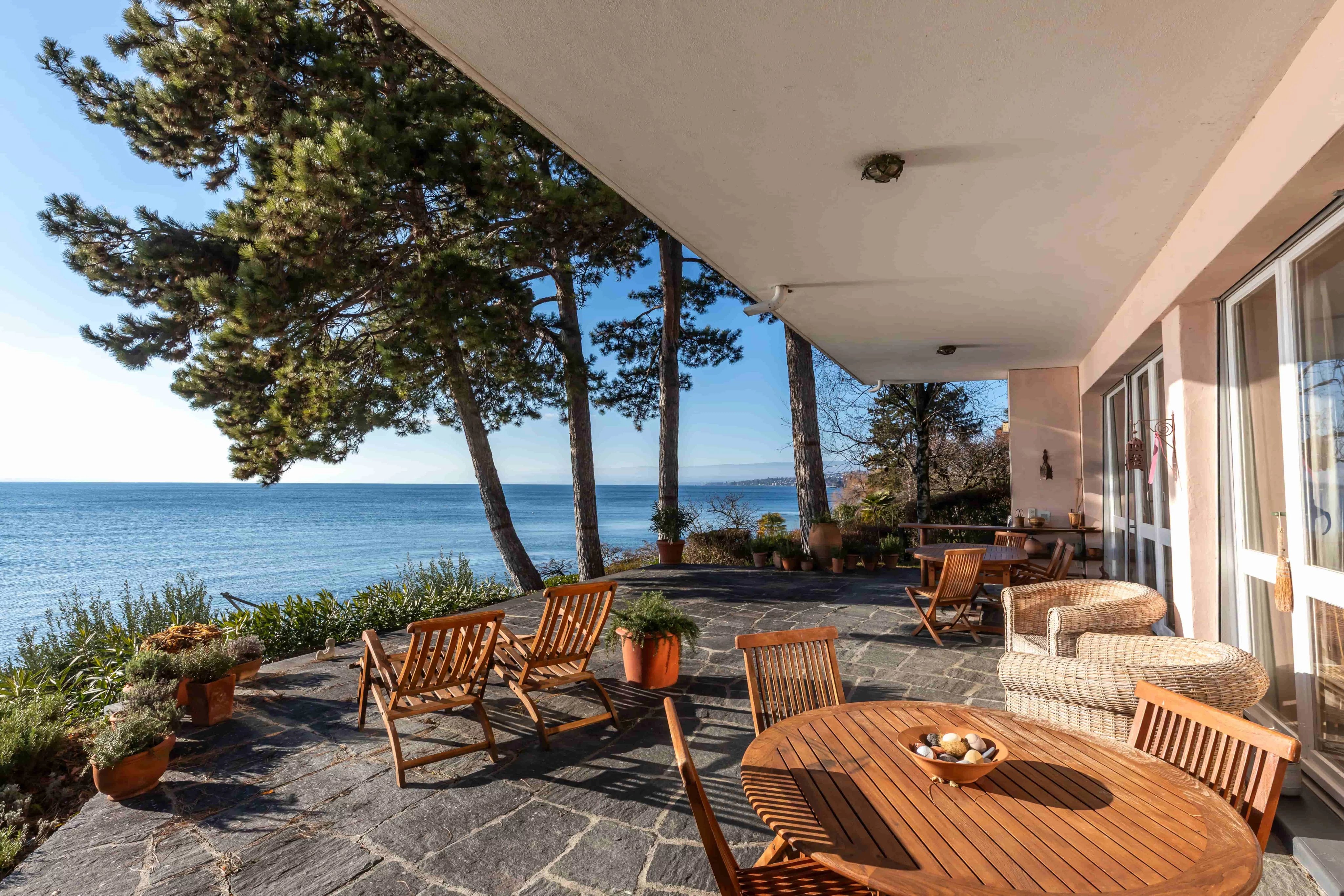 South-facing and shielded from the summer glare by elegant canopies, the large terrace opens spectacularly onto Lake Geneva and the mountains of Savoy. The 180-degree