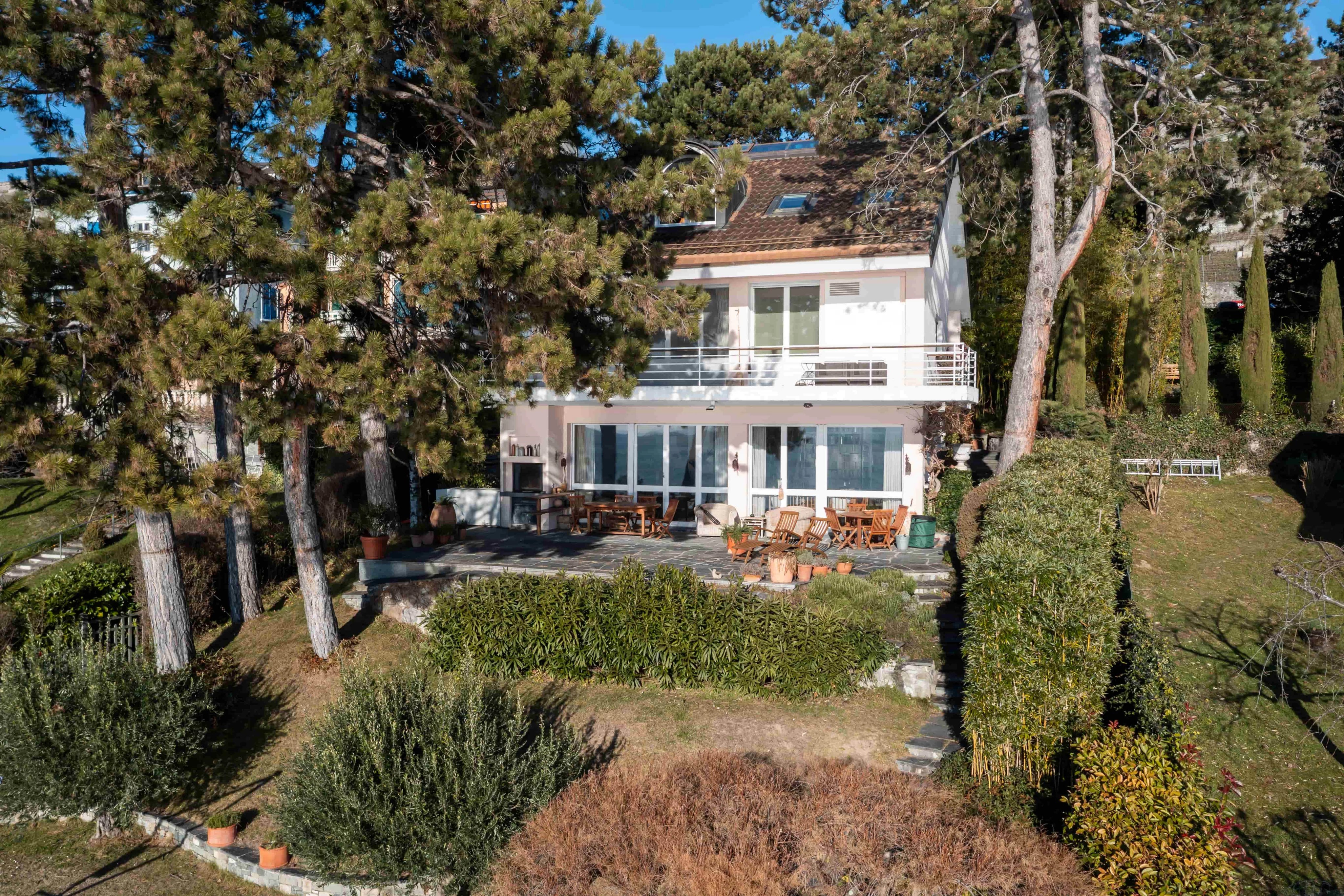 The terraced garden, planted with pines, laurels, and olive trees preserves privacy and evokes a Mediterranean atmosphere. It is a true haven of greenery and summer