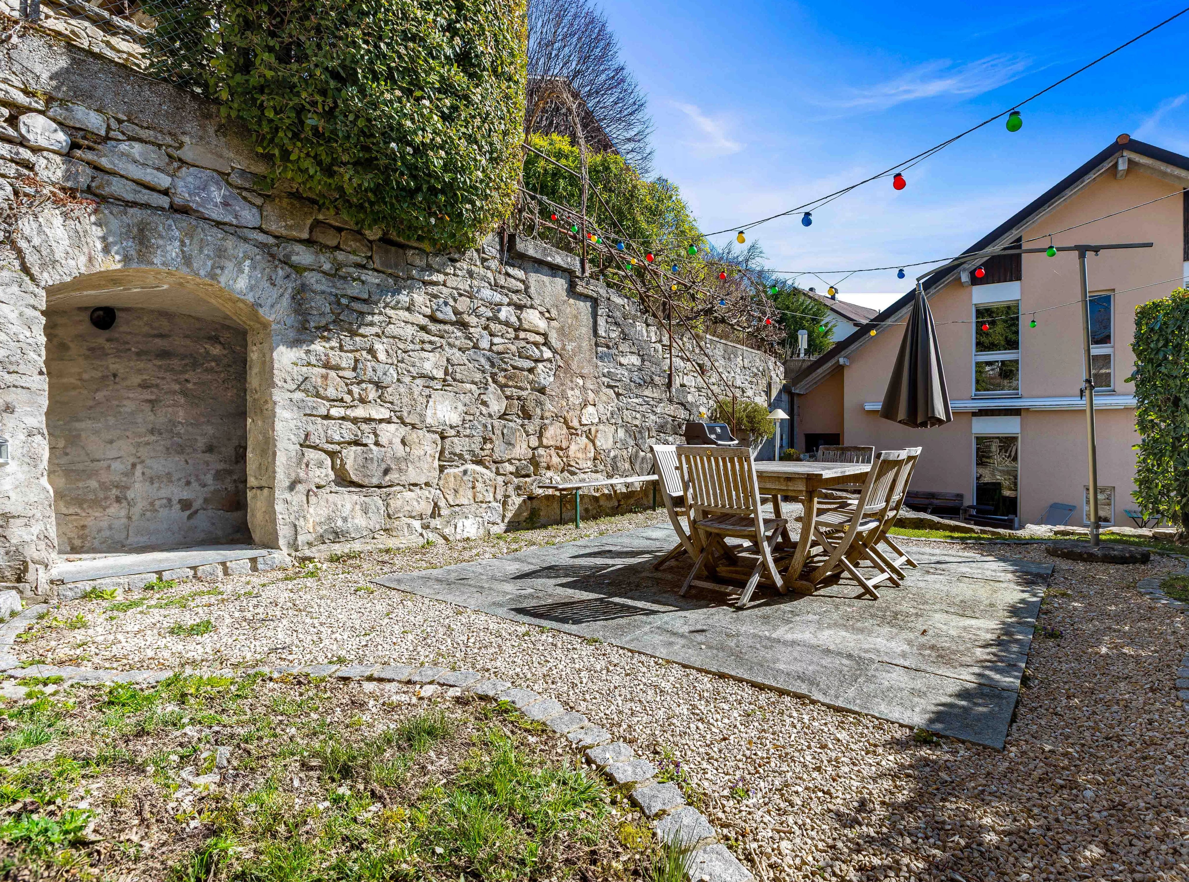 - The terraced plot also offers a beautiful paved "solarium" terrace, as well as a terrace under a pergola at the top of the plot.