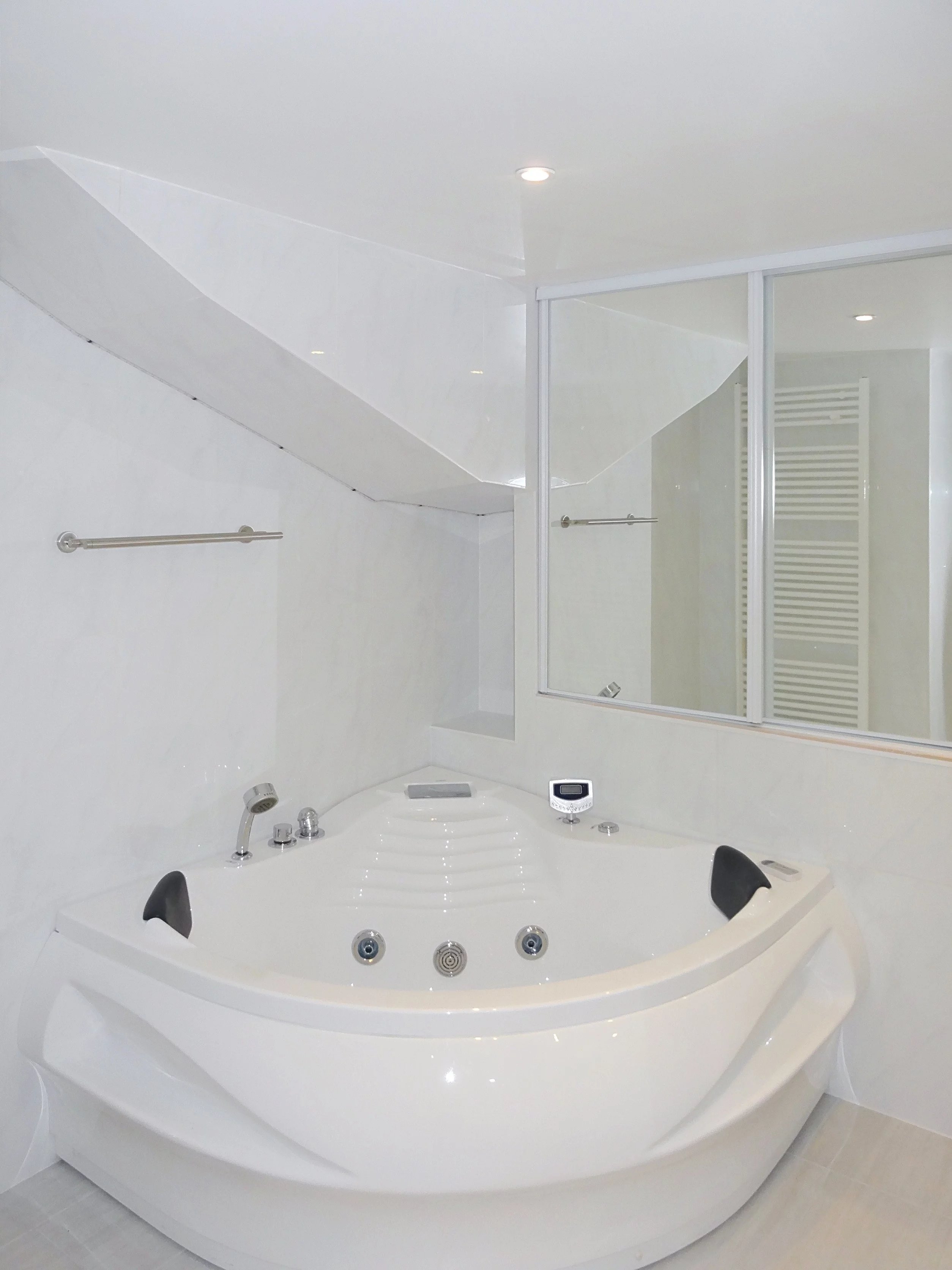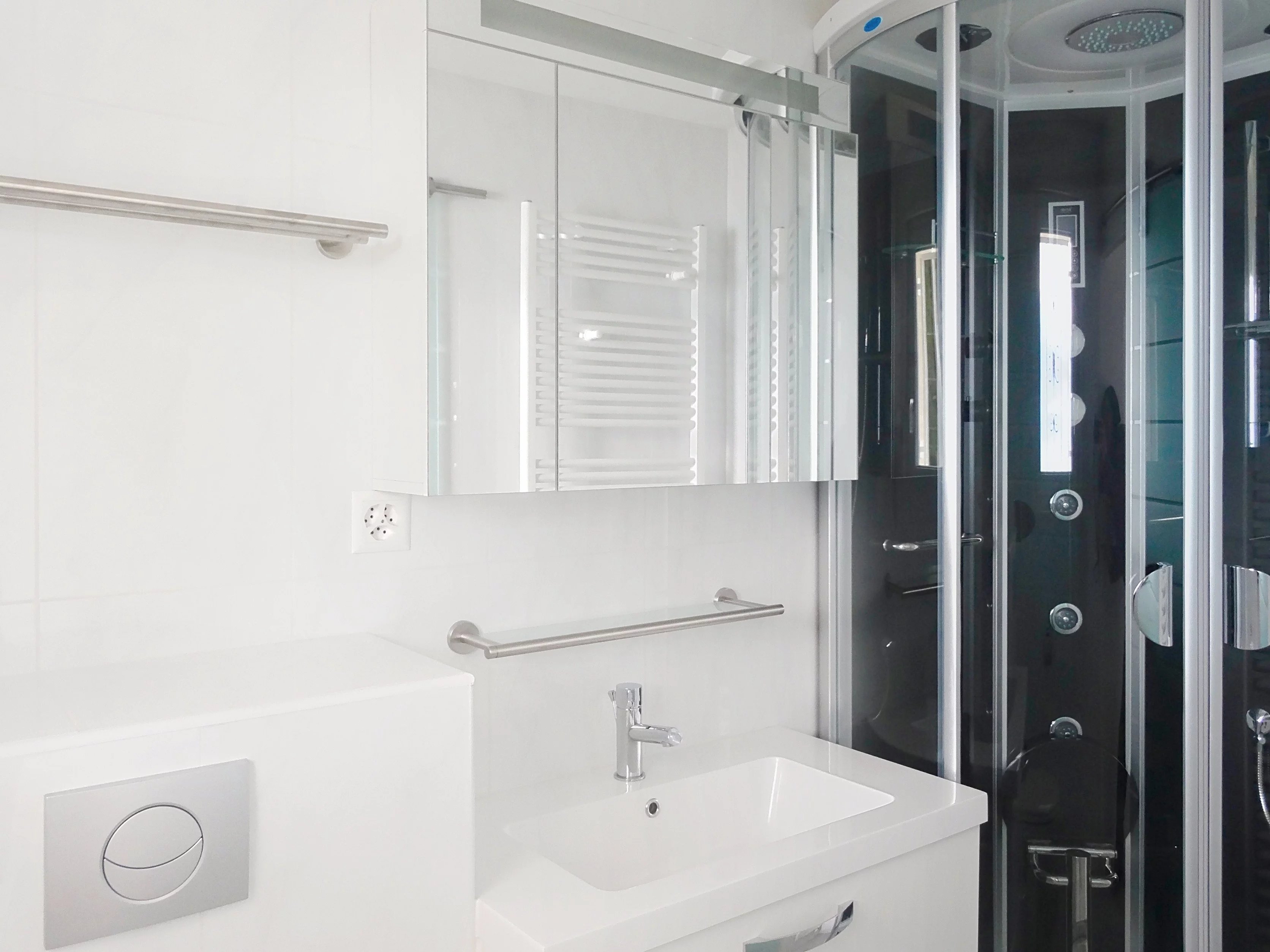 Bedroom with its own hydromassage shower room and WC. Second bedroom, spacious bathroom with Jacuzzi tub and LED lighting. Laundry room with washing machine and dryer. Garden area.