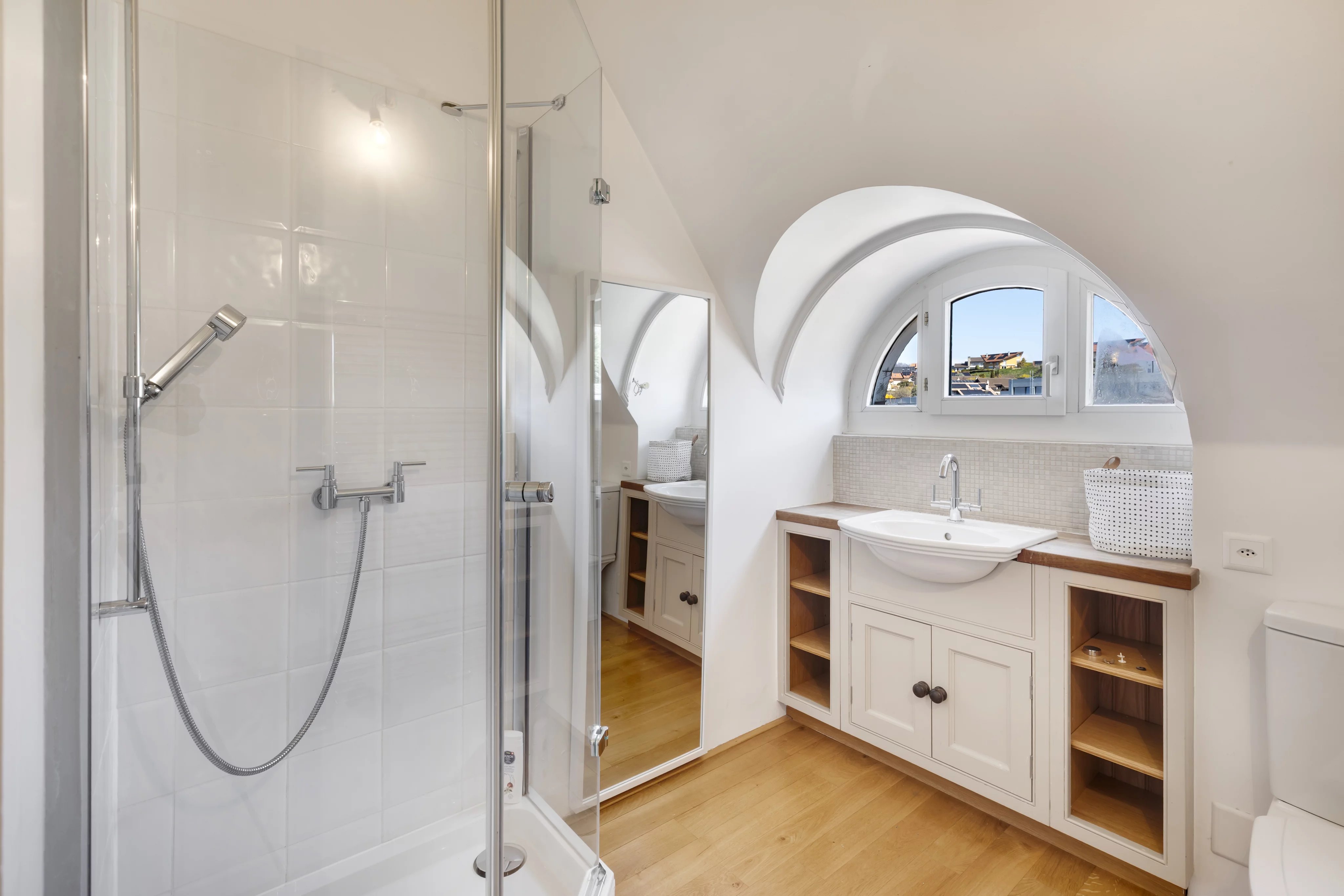 Le premier étage se compose d’une magnifique suite parentale avec terrasse et vue panoramique, comprenant une salle de bains avec douche ainsi qu’un dressing. Une seconde suite disposant d’un balcon, d’une salle de douche avec WC et lavabo. Une chambre supplémentaire, une salle de bains ainsi qu’un WC séparé complètent cet étage.